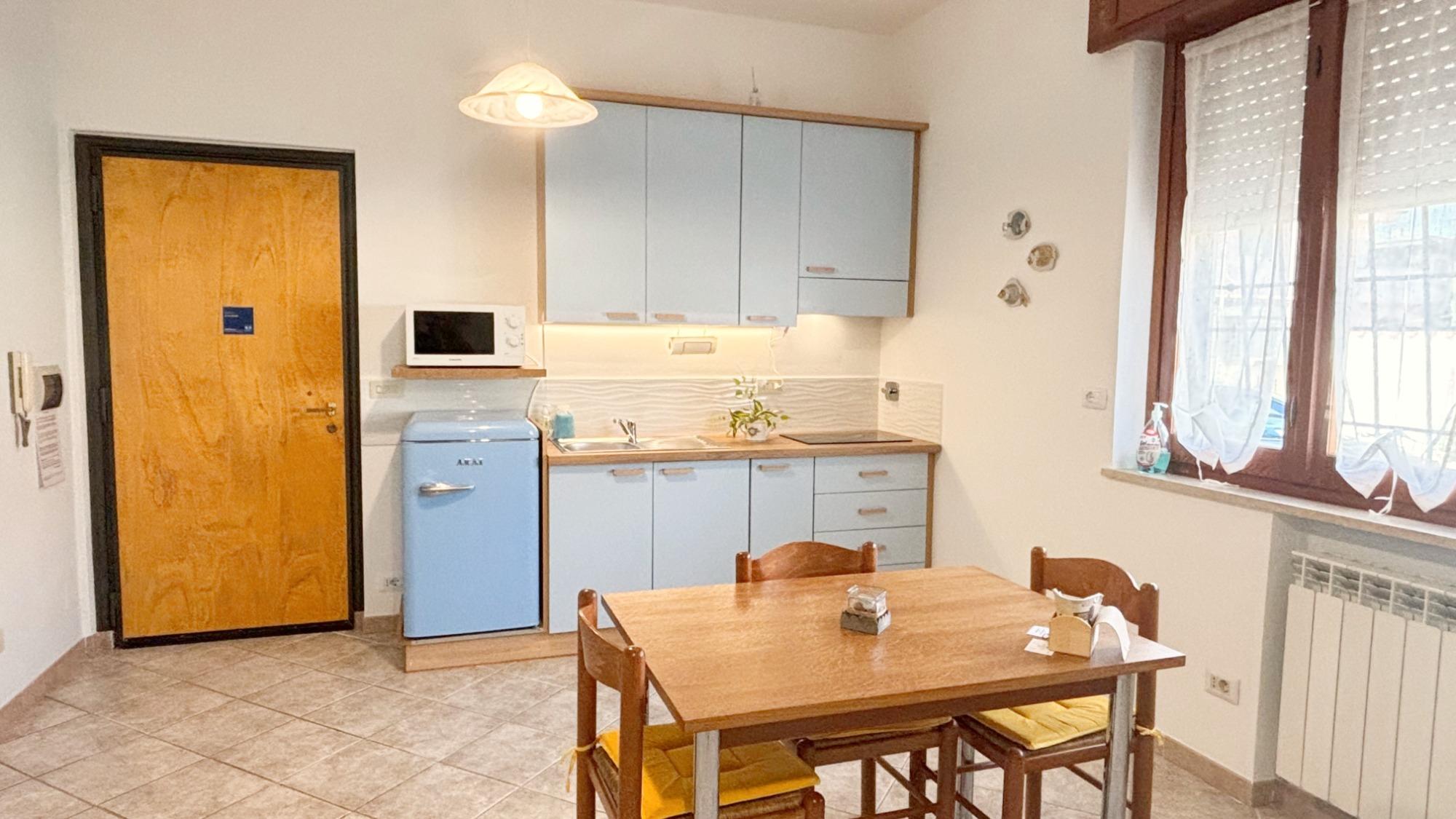 Curato e luminoso, offre una camera matrimoniale con poltrona pouf, soggiorno con divano letto singolo e zona pranzo, cucina attrezzata, bagno con doccia e lavatrice.
